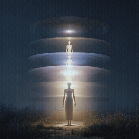 In the dream, I see myself echoing downward, one light‑body after another, as I congeal into matter from light. Each version of me is a copy of a copy of a copy, and yet every layer is still unmistakably me.
