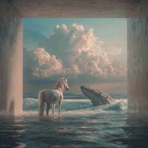 I witness a horse and a whale playing together in the water. I feel the horse’s firmness among the waves as the whale dives and resurfaces from its depths. The whale teaches the horse fluidity, and the horse teaches the whale stability.